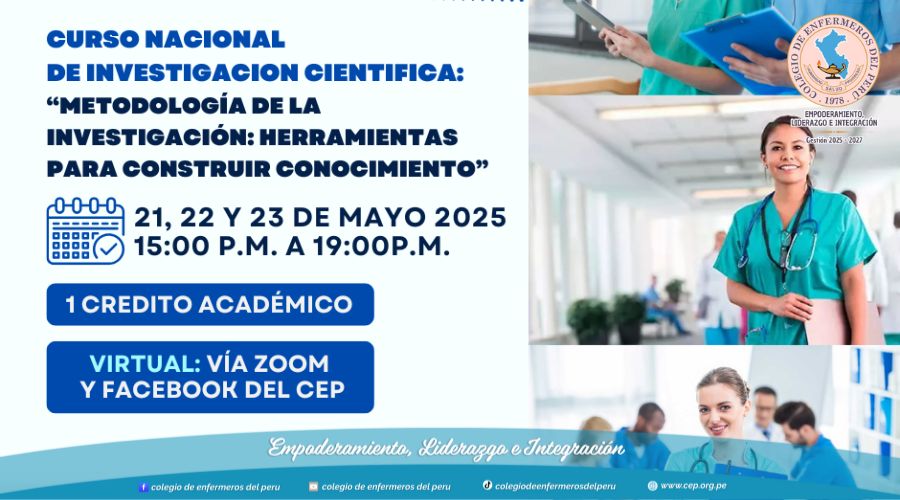 Lima, lunes 26 mayo de 2025. El Colegio de Enfermeros del Perú (CEP), a través de su Consejo Directivo Nacional, realizó con gran éxito el Curso Nacional de Investigación Científica “Metodología de la investigación: Herramientas para construir conocimiento”, los días 21, 22 y 23 de mayo. Durante tres jornadas académicas, desarrolladas de 15:00 a 19:00...Ver más